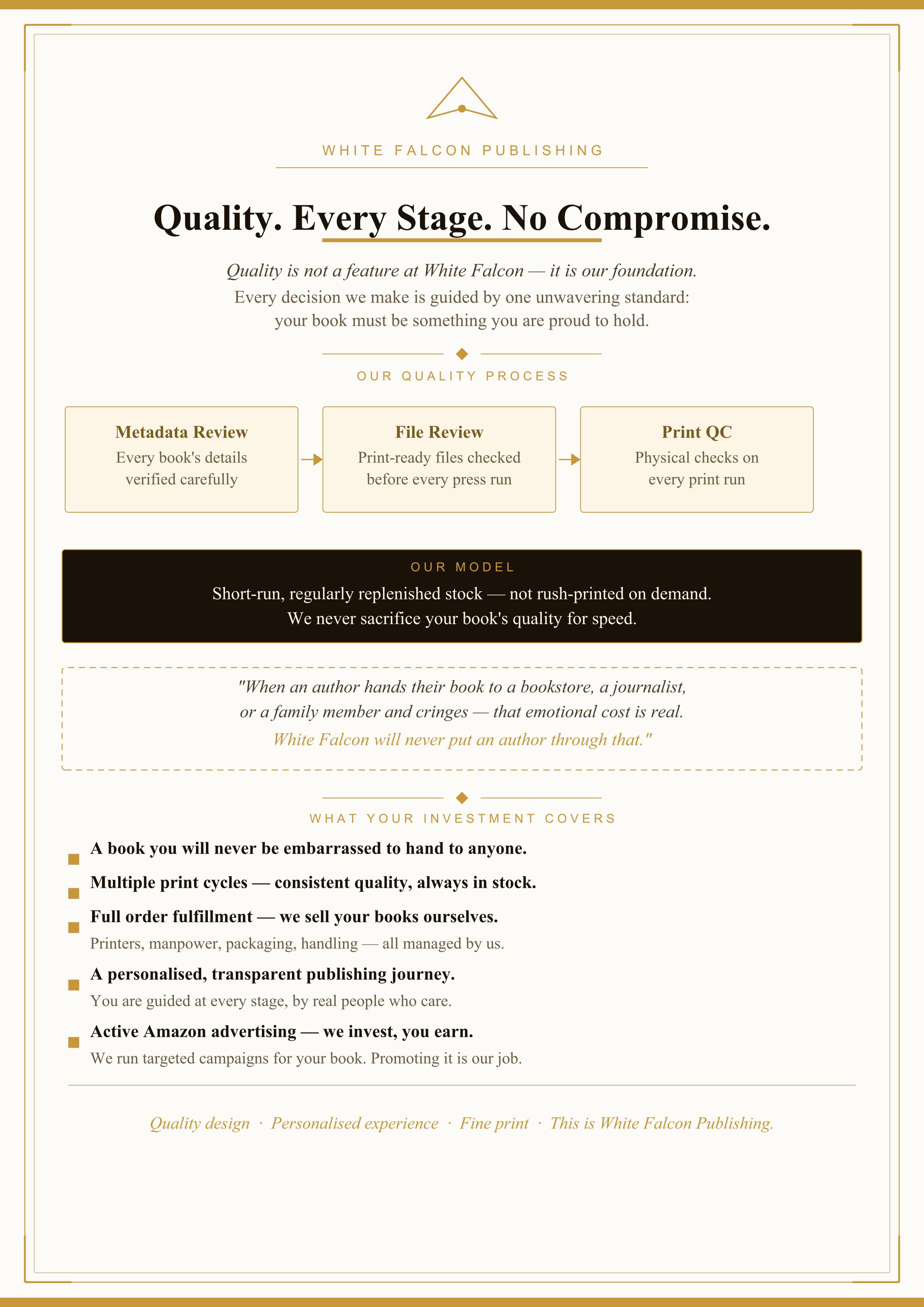 We deliberately operate on a short-run, regularly replenished stock model, and we make no apologies for it. We do not follow the one-book model, where a single copy is rush-printed the moment an order arrives. We have seen what that produces. We have seen authors hand their book to a bookstore buyer, a journalist, or a family member, and quietly cringe at a spine that cracks, text that bleeds off the margin, or a cover that doesn't sit right. That moment of embarrassment is something no author should ever experience. And it is something White Falcon will never put an author through.